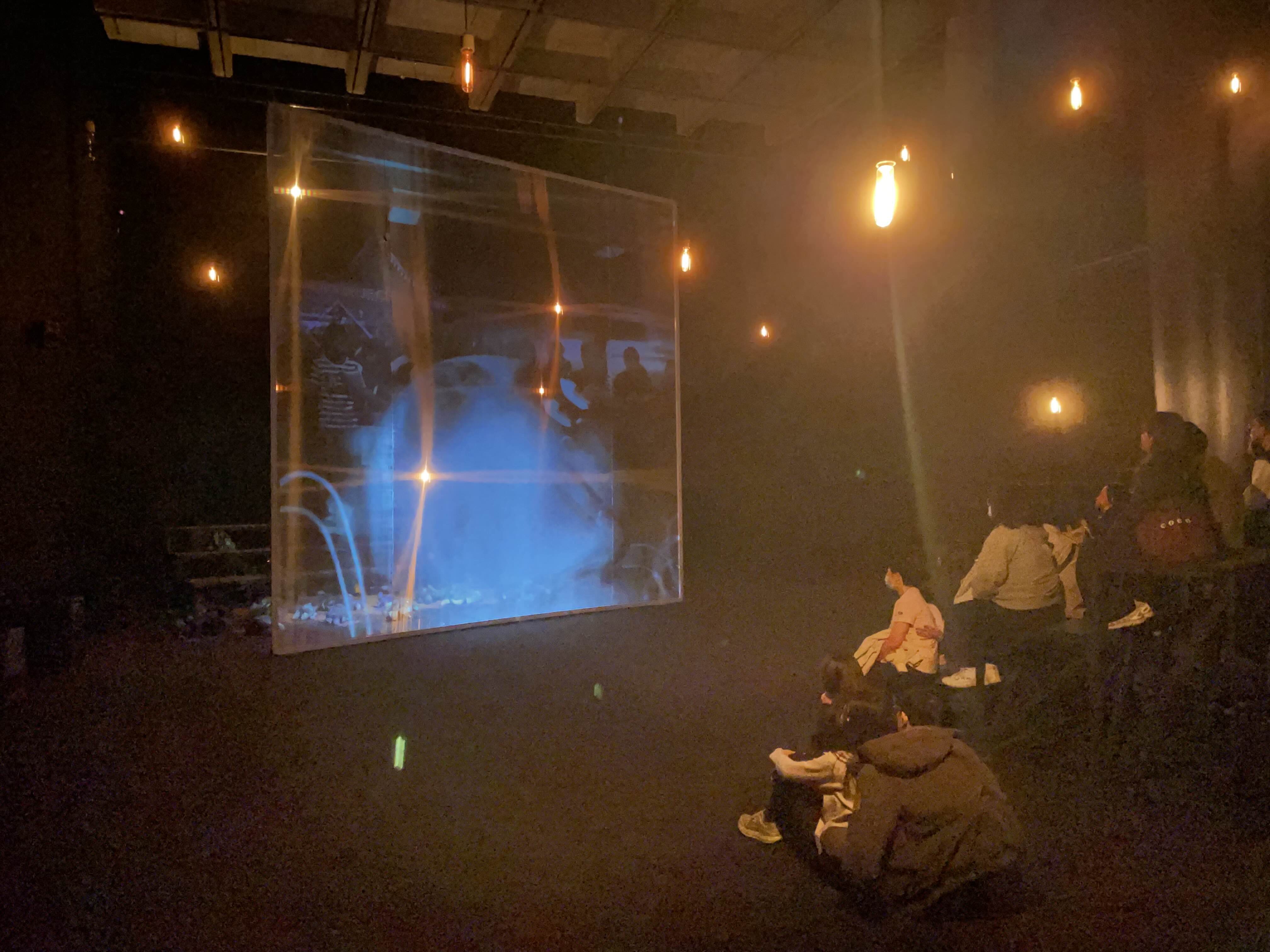 위 사진은 얇은 막을 사이에 두고 프로젝터 영상을 재생하면서도, 뒤에는 사람 모형마냥 인형들이 바닥에 깔려있다. 조명이 영상에 맞게 터지는데, 마치 전투 과정에서 터지는 폭탄 불빛같은 느낌을 자아낸다. 또한 뒤에 있는 앉은 자리가 관객들이 보고 있는 것과 동일하다보니 또 한번 생각할 거리를 던지는 것 같은 전시. 전쟁과 그 속의 사람들의 삶이지 않을까 싶은 전시였다.